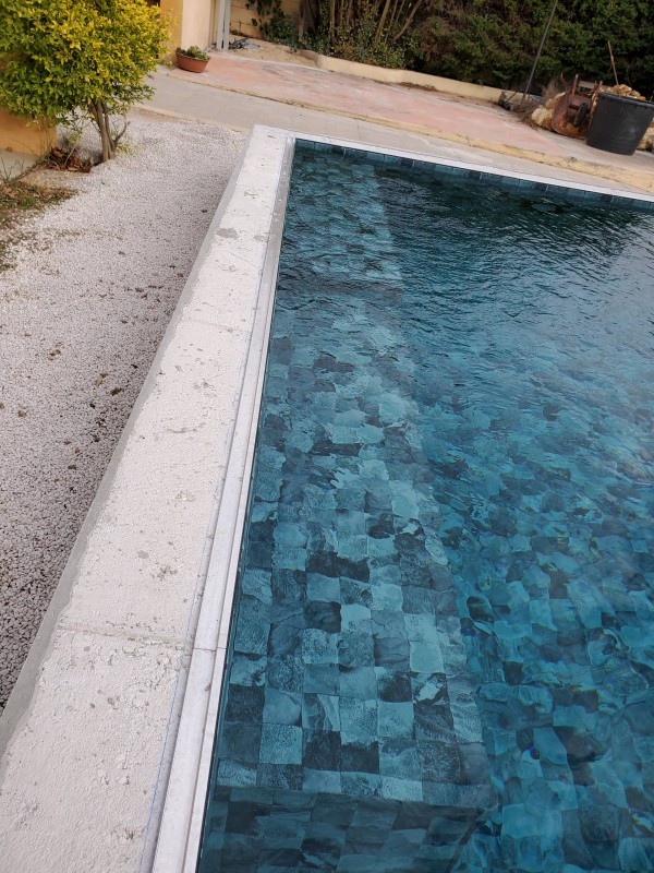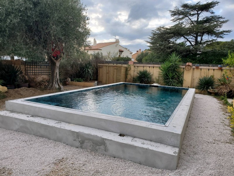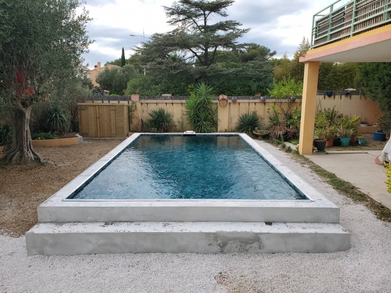 Construction d'une piscine en béton armé avec un revêtement PVC armé réalisée par piscines aménagements à Carry-le-Rouet. La piscine est construite sur un terrain rocheux que nous avons dû casser au brise roche. Le choix du client a été de réaliser une piscine semi-enterrée Pour donner du volume au jardin et limiter les salissures d'entrer dans la piscine avec un coup de vent. Afin de garantir une étanchéité parfaite nous avons réalisé un PVC armé "aquascense Fidji" d'une épaisseur de 150/100ème. L'étanchéité comme la structure et les tuyauteries enterrées bénéficient d'une garantie responsabilité civile décennale et d'une garantie 15 ans par notre fournisseur pour le PVC armé. Pour l'intégration parfaite dans le jardin nous avons choisi des margelles en pierre naturelle Que nous avons aussi posé sur la marche d'accès au bassin. Le groupe de filtration a été installé dans un petit local avec un système de traitement par électrolyseur pour une meilleure gestion du chlore. C'est le moment de vous jeter à l'eau si vous êtes intéressés n'hésitez pas à nous contacter, nous nous ferons un plaisir de nous déplacer pour faire un devis des détaillées.
