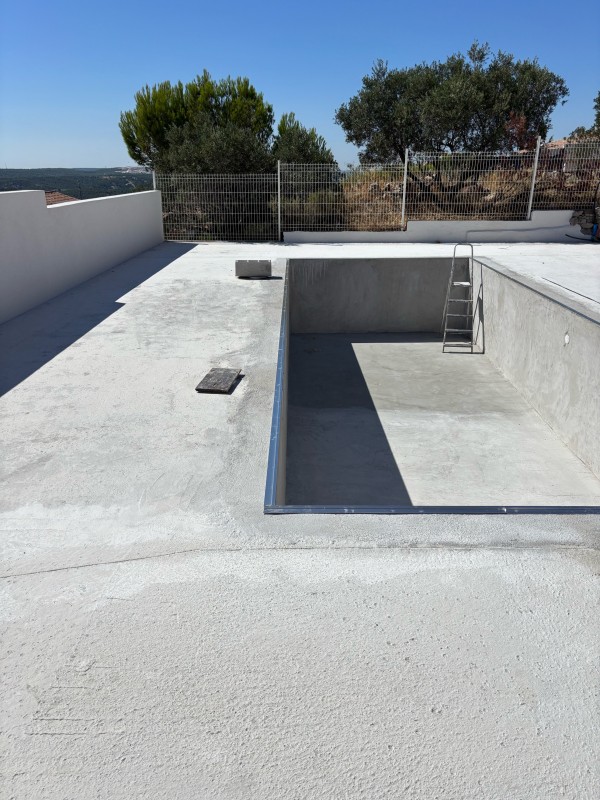 - Étanchéité renforcée avec PVC armé : nous avons appliqué une membrane PVC armé de 1,5 mm, vernie et renforcée par une trame en polyester. La membrane a été thermosoudée sur place, épousant parfaitement les contours du bassin pour une étanchéité optimale.
